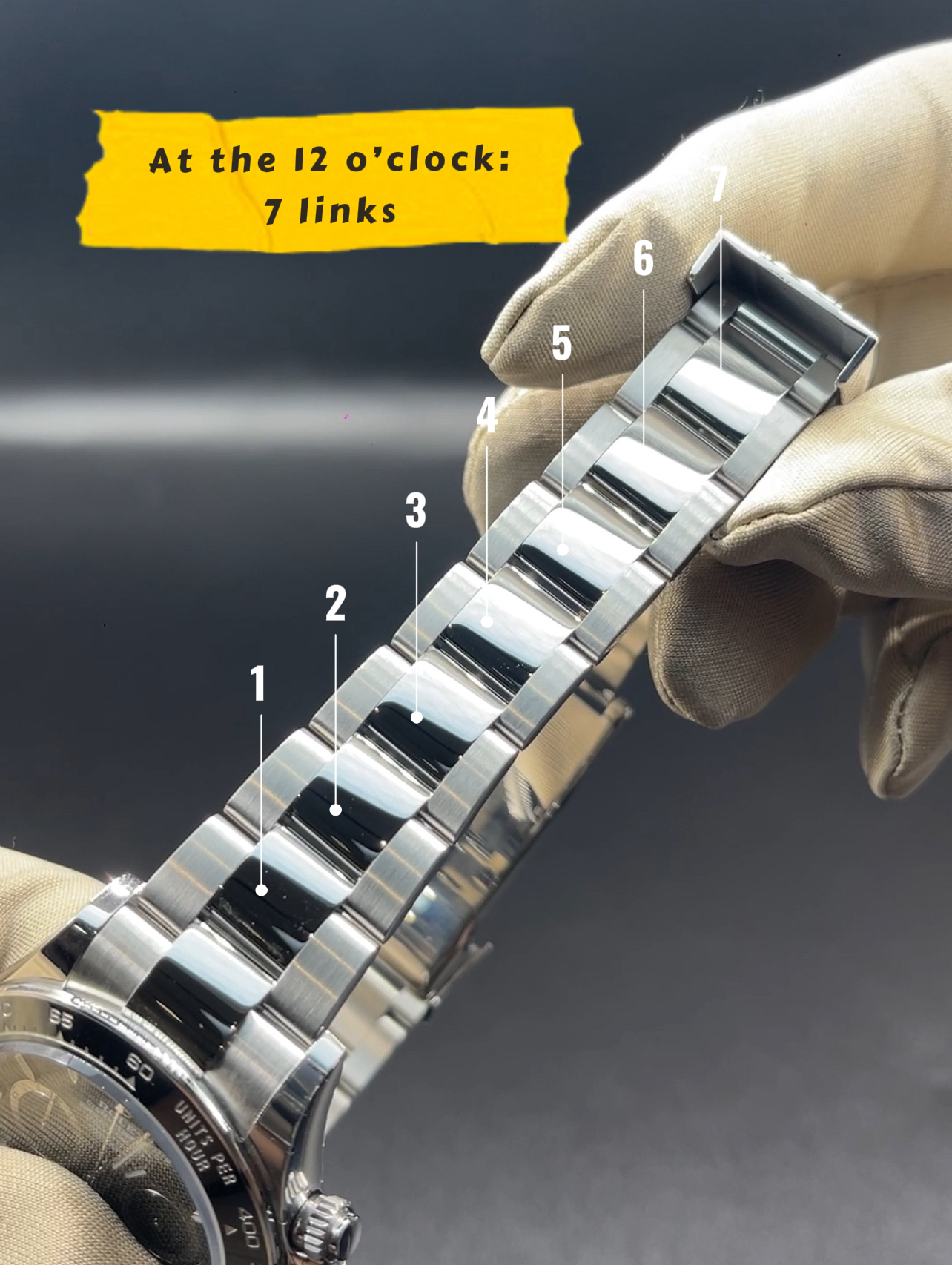 At the 12 o’clock bracelet of the watch, there will be 7 links.
